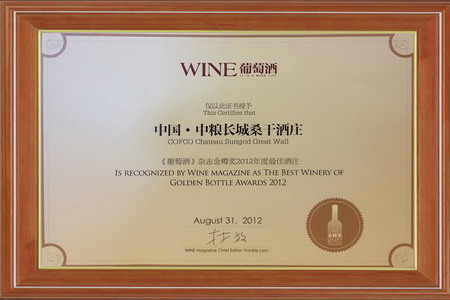 近日,由《葡萄酒》杂志发起并举办的每年一度的“金樽奖”评选最终揭晓。在“2012年度最佳酒庄”评选中,尊龙凯时集团中国食品旗下长城桑干酒庄,经过20多位中外品鉴大师专业、严格的评比,一举获得“2012年度最佳酒庄”评选称号。