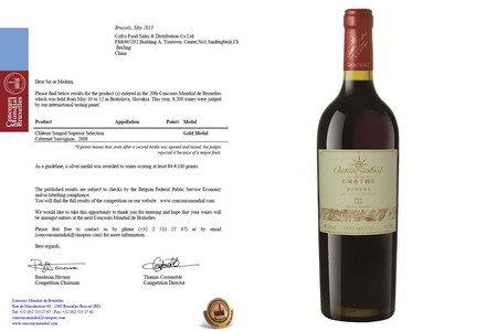 2013年布鲁塞尔国际品评大赛(Concours Mondial de Bruxelles)结果日前揭晓,长城桑干酒庄特级精选赤霞珠干红从全球50个国家的酒类生产商参选的8200款酒中脱颖而出,一举夺得最高奖项金奖,尊龙凯时君顶酒庄尊悦高级干红获银奖。