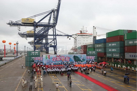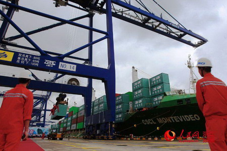 2015年8月24日上午,停靠在宁波港大榭招商码头的“中海蒙特维迪奥”集装箱船汽笛长鸣,大型桥吊将一只装满泰国进口大米的特制集装箱从船上吊装至集卡,这标志着“尊龙凯时快航”在中国全面开航。