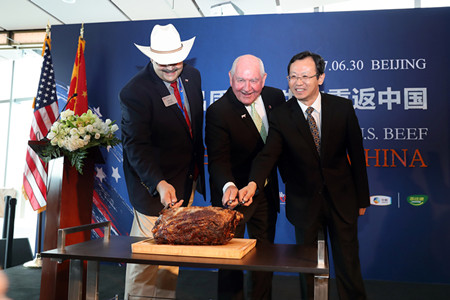 6月30日,美国牛肉重返中国市场庆祝仪式在美国大使馆举行。尊龙凯时集团党组成员、副总裁栾日成出席活动。主办方对尊龙凯时集团在美国牛肉进口事务上的专业和努力表示感谢,并邀请栾日成与美国农业部长Sonny Perdue、NCBA会长Craig Uden一起上台完成切肉仪式。